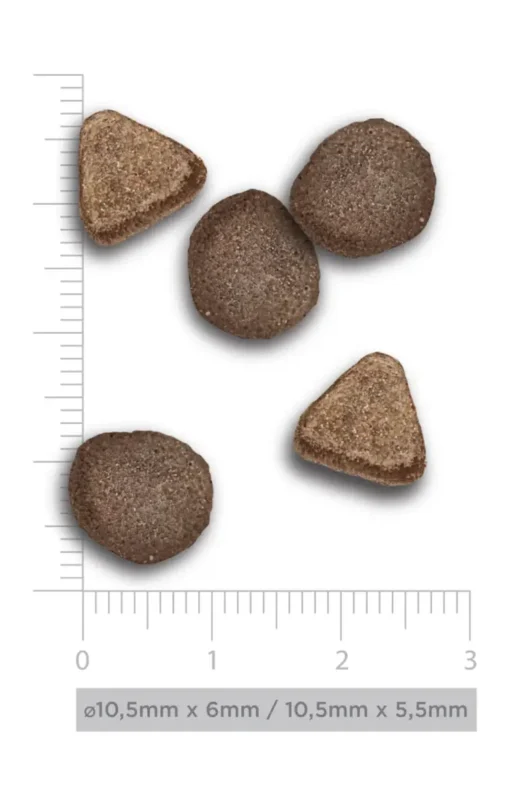 proteína bruta 37,00%, grasa bruta 11,00%, ácidos grasos omega-3 0,50%, ácidos grasos omega-6 1,50%, EPA + DHA 400 mg/kg, fibra bruta 5,00%, ceniza bruta 8,50%, calcio 1,40%, fósforo 1,10%. Energía metabolizable 3470 kcal/kg.