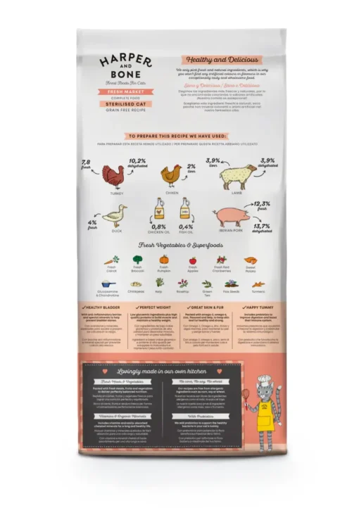 Cerdo ibérico deshidratado 13,7%, cerdo ibérico deshuesado preparado en fresco 12,3%, guisantes verdes enteros, pavo deshidratado 10,2%, patata deshidratada, fibra de manzana, pato deshuesado preparado en fresco 4%, pulpa de remolacha, hígado de cordero preparado en fresco 3,9%, pavo deshuesado preparado en fresco 3,9%, cordero deshidratado 3,9%, hígado de pavo preparado en fresco 3,9%, hígado de pollo hidrolizado 2%, semillas de lino (fuente natural de ácidos grasos ω3) 1,1%, aceite de pollo (protegido con tocoferoles naturales) 0,8%, levaduras (Saccharomyces cerevisiae), aceite de pescado (protegido con tocoferoles naturales) 0,4%, minerales, brócoli fresco 1000 mg/kg, calabaza fresca 1000 mg/kg, zanahorias frescas 1000 mg/kg, manzanas frescas 1000 mg/kg, pared celular hidrolizada de levaduras (fuente de MOS) 1000 mg/kg, achicoria (fuente de FOS) 1000 mg/kg, glucosamina 500 mg/kg, extracto de mandarina 500 mg/kg, condroitina 300 mg/kg, Yucca schidigera 200 mg/kg, alga kelp 30 mg/kg, arándanos rojos enteros 30 mg/kg, rosa canina (rica en vitamina C) 30 mg/kg, té verde 30 mg/kg, cúrcuma 30 mg/kg.